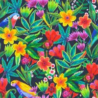 Pretty pair is a luscious tropical print featuring vibrant flowers, saturated green foliage and 2 birds.
